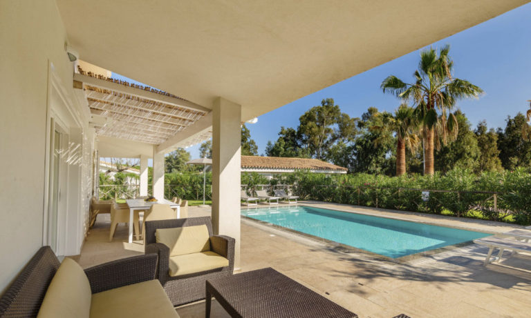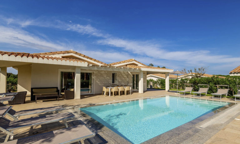 - Vila s privátním bazénem – 120 m2 – max. obsazenost 10 osob (pohodlnější ubytování je v kombinaci 8 dospělých + 2 děti do 10 let). Idální pro 8 osob. Vzdálenost od pláže je cca 200 až 250 m. Jedná se o samostatně stojící vilky s privátním bazénem, soláriem a 6ti lehátky. Vily mají krytou terasu s jídelním stolem (posezením) a privátní zahrádku s trávníkem. Vila disponuje třemi koupelnami (dvě z koupelen jsou privátní a přiléhají k pokojům s manželskými lůžky.). Vila má čtyři samostatné pokoje (dva s manželskou postelí typu Queen, další dva vždy se dvěma samostatnými lůžky). Další dvě místa na spaní se nacházejí v „obyváko-kuchyni“, kde naleznete rozkládací gauč pro dvě osoby. Hostům je k dispozici samozřejmě také v rámci komplexu vil společný bazén se soláriem a lehátky. Vilky s bazénem jsou pouze 4.