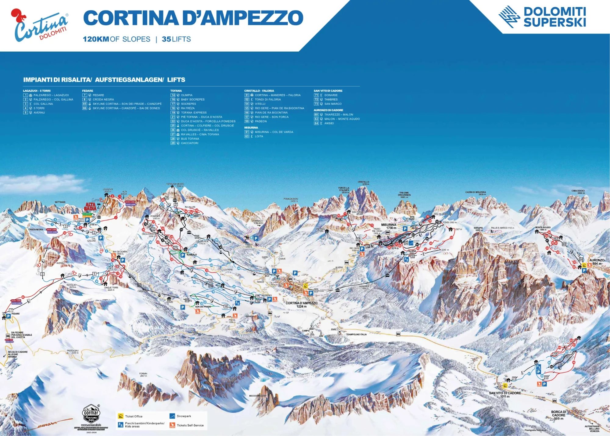 Cortina d´Ampezzo se nachází v centru východní části Dolomit, a dá se říct, že v Dolomitech není jiné město, které by bylo obklopeno ze všech stran rozeklanými třítisícovkami, tak, jak je tomu v případě Cortiny. Na svazích kolem města je k dispozici mnoho různorodých lyžařských terénů. Svými lyžařskými areály Faloria -Tondi, Cristallo, Tofana, Falzarego – Cinque Torri a Socrepes-Pocol láká své návštěvníky na perfektní lyžovačku. Můžete lyžovat mezi kolmými stěnami a skalními komíny. Sjezdovky je totiž mnohdy prostupují. Jsou tu vynikající „modré“ louky, tratě střední obtížnosti, ale i velice náročné černé sjezdovky. Pestrý je také výběr pro skialpinisty.